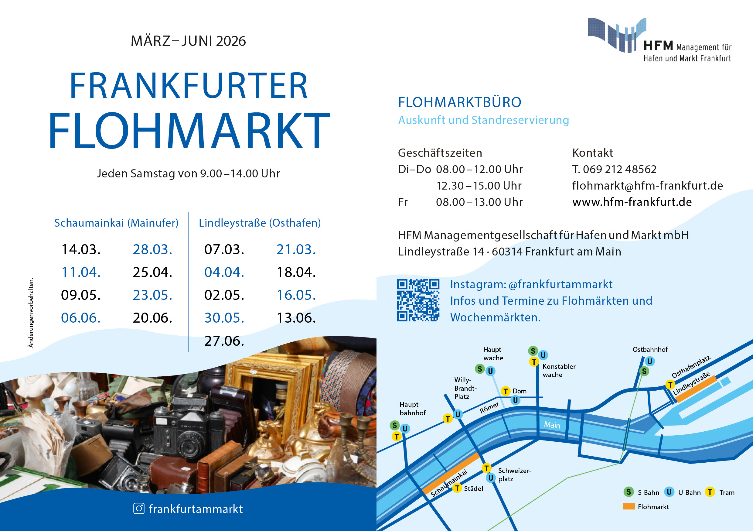 Jeden Samstag (Feiertage ausgenommen) zwischen 9:00 und 14:00 Uhr lädt der Frankfurter Flohmarkt zur „Schnäppchenjagd“ an den Schaumainkai oder in den Osthafen I ein.